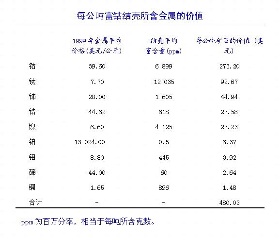 ??? 除鈷之外,結(jié)殼還是其他許多金屬和稀土元素的重要潛在來源,如鈦、鈰、鎳、鉑、錳、磷、鉈、碲、鋯、鎢、鉍和鉬。結(jié)殼由水羥錳礦(氧化錳)和水纖鐵礦(氧化鐵)組成。較厚結(jié)殼有一定數(shù)量的碳磷灰石,大部分結(jié)殼含少量石英和長石。結(jié)殼鈷含量很高,可高達(dá)1.7%;在某些海山的大片面積上,結(jié)殼的鈷平均含量可高達(dá)1%。這些鈷的含量比陸基鈷礦0.1%至0.2%的含量高得多。在鈷之后,結(jié)殼中最有價(jià)值的礦物依次為鈦、鈰、鎳和鋯。