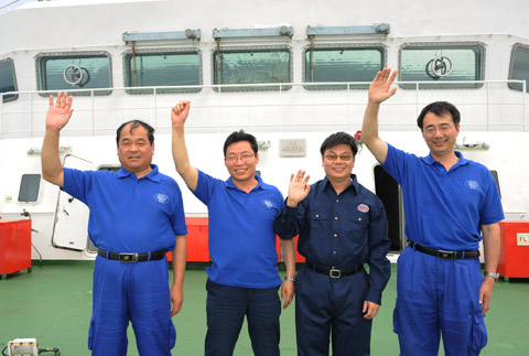 1,蛟龍號海試總指揮劉峰(左二)、“海洋六號”船首席科學家楊勝雄(右二)、海試臨時黨委書記劉心成(左一)等科學家在船甲板上合影。