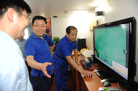 當日,正在太平洋海域執行7000米級載人下潛任務的蛟龍號海試專家組一行9人, 來到 “海洋六號”船上和擔任護衛和技術保障任務的的科學家們會師。會師后科學家們一起參觀了“海洋六號”船上的先進科考設備,并對蛟龍號取得的部分成果進行研討。
