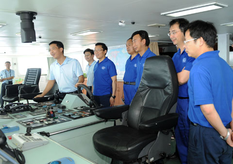 3,科學(xué)家們在“海洋六號”船駕駛臺前了解各種設(shè)備的特點。