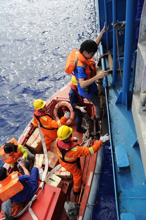 4,專家組成員們乘坐工作艇登上“海洋六號”船。
