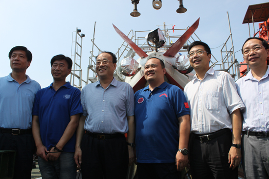 國家海洋局副局長、中國大洋協(xié)會理事長王飛與潛航員及各單位領(lǐng)導(dǎo)合影