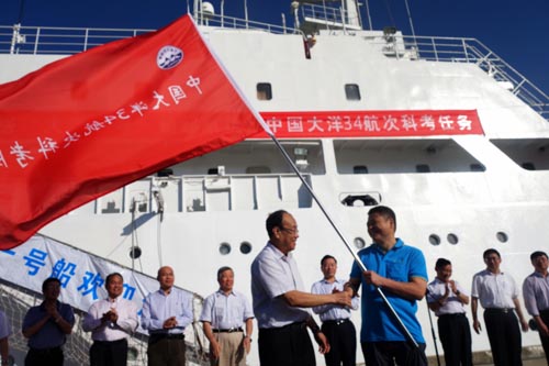 國家海洋局黨組成員、副局長,中國大洋協(xié)會理事長王飛向考察隊(duì)授旗