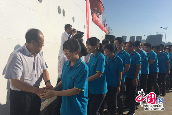 國(guó)家海洋局副局長(zhǎng)、中國(guó)大洋協(xié)會(huì)理事長(zhǎng)王飛為參航人員送船(攝影/中國(guó)網(wǎng) 馮竹)
