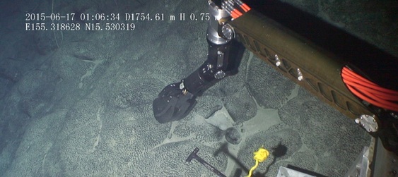 “海馬”機械手抓住一塊鈷結核準備放入樣品框中。(圖片截取自“海馬”拍攝的高清視頻)
