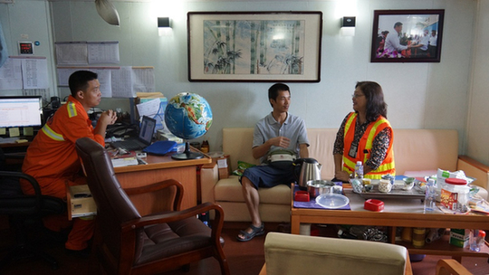 即將回國的第二航段的船長藍明華和即將出海的第三航段船長孫雁鳴在交接工作并與關島代理商量有關事宜。