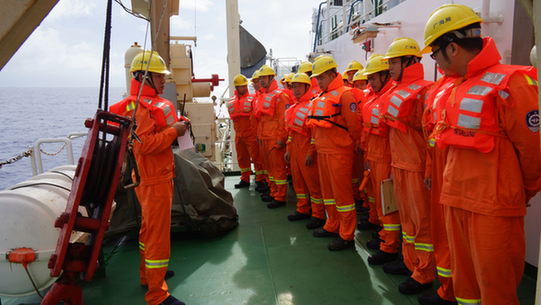 一場(chǎng)別開(kāi)生面的棄船演習(xí)在海洋六號(hào)甲板上舉行。