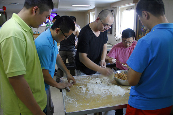 恰逢一個特別的冬至,特別之處不僅在于記者第一次出海,并且在于這是記者第一次穿著夏裝過“冬至”。規(guī)矩不能廢,“向陽紅10”船的大廚早在昨天就號召大家,今天下午三點到餐廳集體包水餃。于是,一場轟轟烈烈的“非正式包水餃大賽”就此拉開了帷幕。