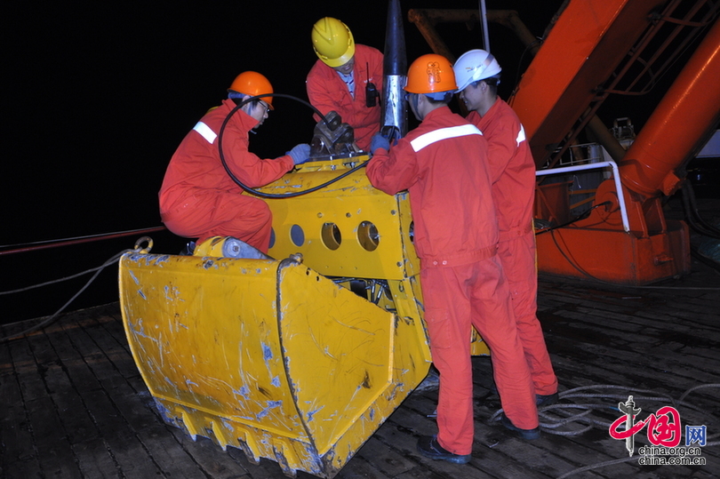 由于第一次的電視抓斗作業(yè)沒能在海底有所收獲,這一次的電視抓斗作業(yè),作業(yè)組卯足了勁準備。經(jīng)過了對電視抓斗、兩個濁度儀、絞車的反復(fù)檢查準備,當?shù)貢r間2月18日晚上10點,電視抓斗順利入水了。