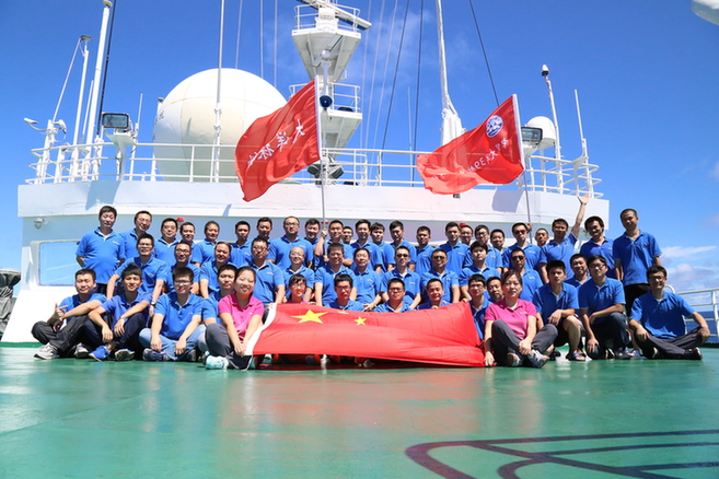 吃過午飯的隊員們穿上統一的服裝來到駕駛臺前面的甲板上,與奮斗在一起幾十天的同事們在返航這個重要的時刻留下難忘的影像。返航的天氣難得的好,云淡風輕,天空藍得像張被染色的畫布,陽光映在隊員們的臉上,每個人都掛著輕松愉快的笑容,這其中有共同奮斗過兩個航段的隊友,也有多年交情的好兄弟,看著畫面美好,我不禁想到當初起航前大家在停泊的“大洋一號”船旁合影,感覺只是昨天。“咔嚓”一聲,笑容定格。
