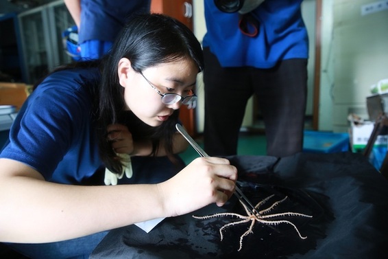 科考隊(duì)員在觀察海星