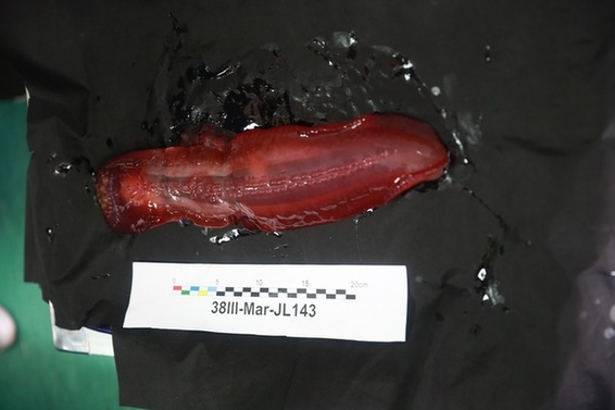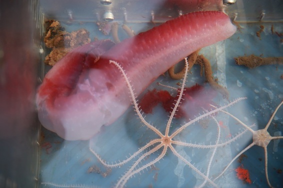 唐嘉陵告訴中國(guó)海洋報(bào)記者,今天運(yùn)氣很好,抓到了一只35公分左右的海參。當(dāng)“蛟龍”號(hào)快要到達(dá)4800米海底時(shí),就看到了一只紅色巨型海參。不過(guò)它對(duì)“蛟龍”號(hào)的到來(lái)并不歡迎,還沒(méi)等潛水器坐底,它就溜走了,逃跑的姿勢(shì)是S型,像跳舞一樣。半小時(shí)后,唐嘉陵又看到了一只同樣的海參。“這次不能讓他溜掉。”唐嘉陵說(shuō),我迅速打開(kāi)“龍爪”輕輕抓住了它,但因體型較大,機(jī)械手并不能完全握住它,它不斷掙扎想要逃跑,當(dāng)我要把他放進(jìn)采樣筐時(shí),海參掙脫出來(lái)卻跑錯(cuò)了方向,自己游進(jìn)了筐里。