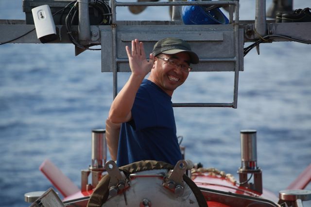 新華社記者劉詩平搭乘“蛟龍”號完成在世界最深處下潛 郭松嶠攝(新華社)