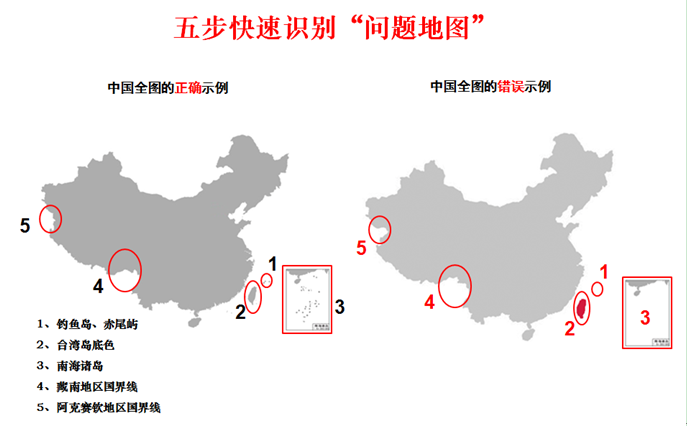 我們說(shuō)的“問(wèn)題地圖”主要指存在危害國(guó)家主權(quán)統(tǒng)一、領(lǐng)土完整、安全和利益等嚴(yán)重問(wèn)題的地圖,“問(wèn)題地圖”的常見(jiàn)錯(cuò)誤有漏繪釣魚(yú)島、赤尾嶼、南海諸島等重要島嶼,錯(cuò)誤表示臺(tái)灣省、錯(cuò)繪藏南地區(qū)和阿克賽欽地區(qū)國(guó)界線等。